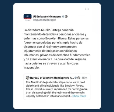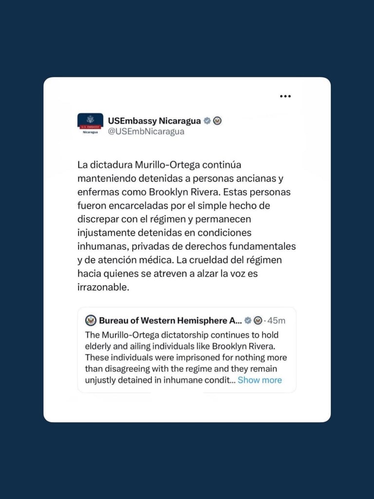 El pronunciamiento fue difundido por la Oficina de Asuntos del Hemisferio Occidental del Departamento de Estado y replicado por la Embajada de Estados Unidos en Nicaragua. El mensaje es inequívoco: el régimen continúa deteniendo injustamente a ciudadanos cuyo único “delito” ha sido disentir políticamente y los mantiene privados de atención médica básica.
