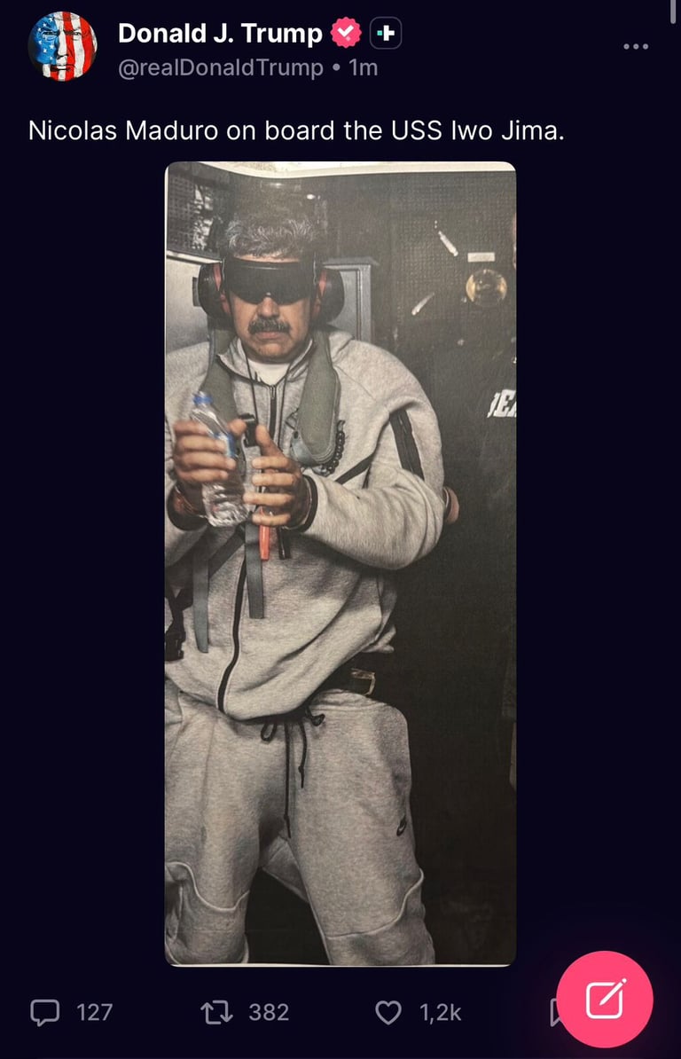 El presidente de Estados Unidos Donald Trump aseguró este sábado 03 de enero, que Nicolás Maduro se encuentra bajo custodia de Estados Unidos, respaldando su afirmación con la publicación de una fotografía que, según él, muestra al mandatario venezolano a bordo del buque USS Iwo Jima.